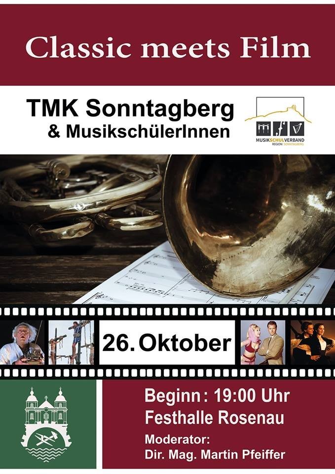 Unser diesjähriges Konzert steht unter dem Motto "Classic meets Film". Für eine abwechslungsreiche Moderation sorgt Martin Pfeiffer, seines Zeichens bekannt von den Vierkantern und M4-TV. Beginn ist um 19.00 in der Festhalle Rosenau. Für einen musikalischen Hochgenuss sorgen nicht nur die Musikanten der TMK-Sonntagberg, sondern auch Musikschüler vom Musikschulverband Sonntagberg. Wir freuen uns auf zahlreichen Besuch!Classic meets Film