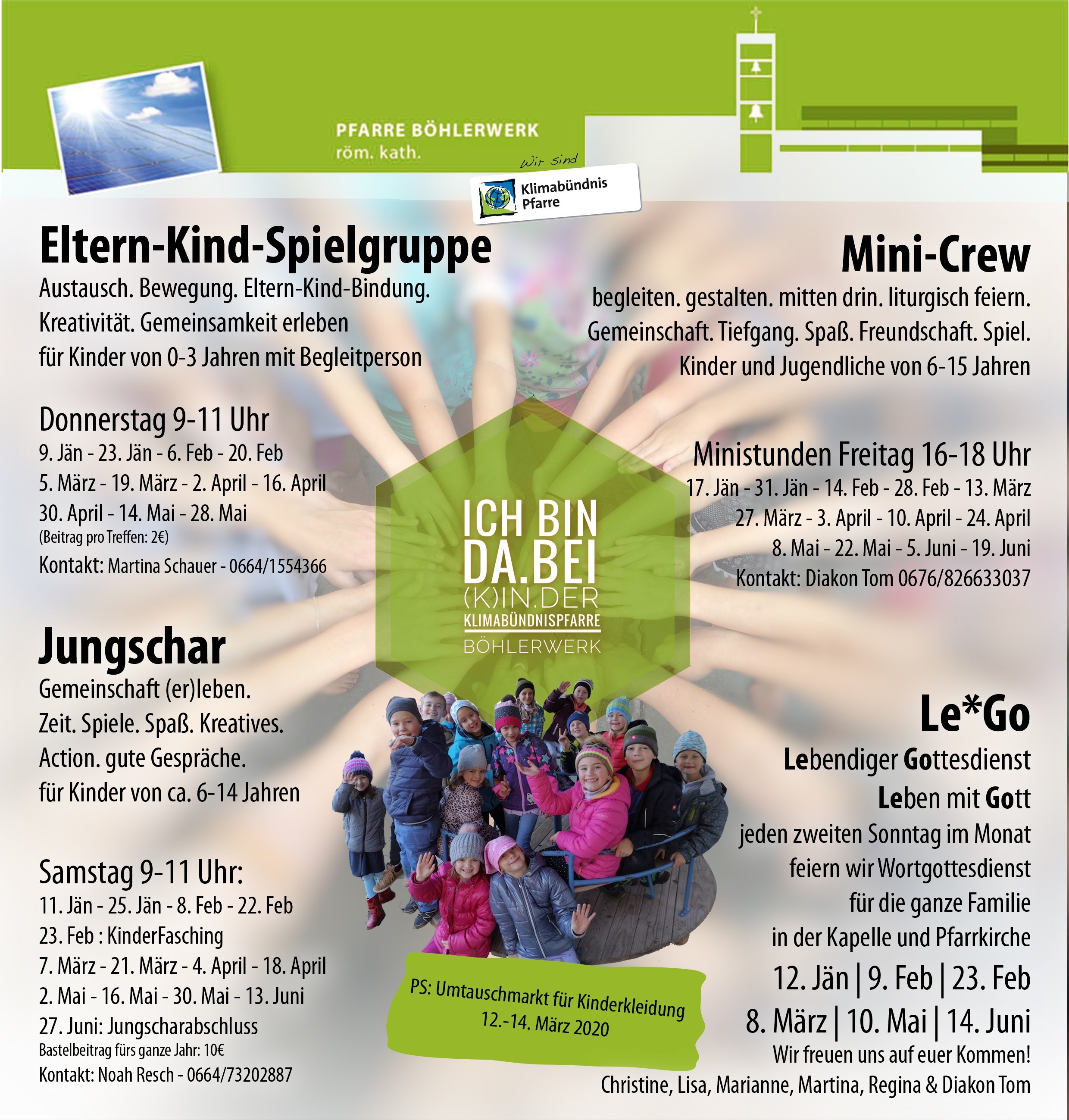 Alle 2 Wochen steht den Kindern das Pfarrzentrum offen. Jedes Treffen steht unter einem anderen Thema, das sich das Jungschar-Team rund um Noah, Patrick, Gerhard, Angelina, Marlene, Babsi und Lisa überlegt.