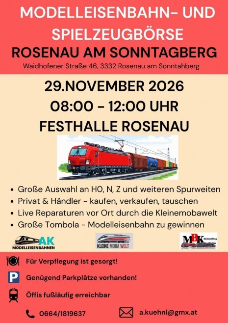 Auch heuer veranstalten wir wieder eine Modelleisenbahn- und Spielzeugbörse in der Festhalle Rosenau am Sonntagberg. Kommen Sie vorbei und kaufen, verkaufen und tauschen Sie Modelleisenbahn und Spielzeug von Privaten und Händlern in vorweihnachtlichem Ambiente. Defekte oder nicht fahrtüchtige Lokomotiven? Auch dieses mal ist der bekannte Youtuber Kleinemobawelt vor Ort und wird Live-Reparaturen durchführen. MOBA Klub Kleinreifling: Der Kleinreiflinger MOBA Klub ist mit einer Schauanlage vor Ort und ermöglicht auch jedem kleinen Modellbahnfan eine Runde mit einem Zug zu fahren. Tombola: Das erste mal wird es heuer eine Tombola geben. Zu gewinnen gibt es Modelleisenbahn, Gutscheine und andere Dinge. Seien Sie gespannt und kaufen Sie sich ein Los!