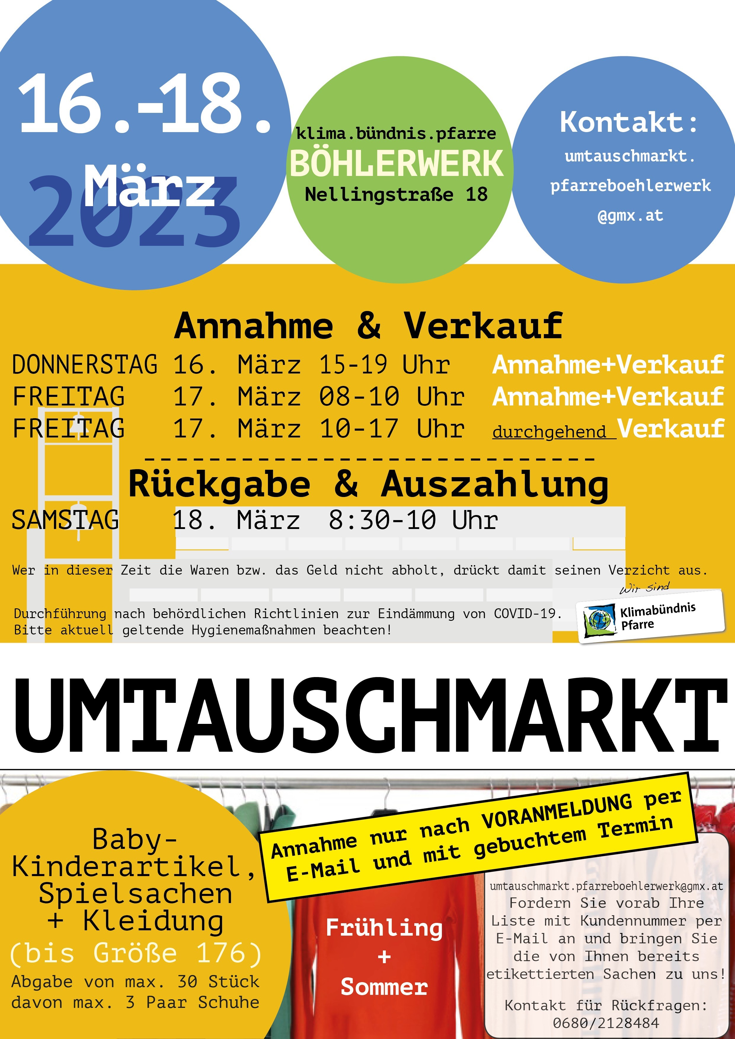 Verkäufer*innen melden sich bitte unter umtauschmarkt.pfarreboehlerwerk@gmx.at an, um eine Listennummer zu erhalten. Die Artikel können dann zu einem vorab gebuchten Termin (zwischen DO 15:00 und FR 10:00) gebracht werden. Rückgabe und Auszahlung: SA 8:30-10:00 Kontakt für Rückfragen: 0680/2128484