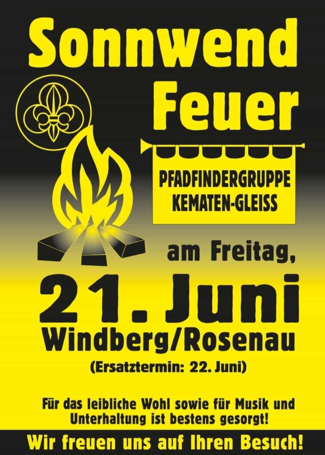 Auch heuer lädt die Pfadfindergruppe Kematen-Gleiß wieder zum alljährlichen Sonnwendfeuer nach Windberg.