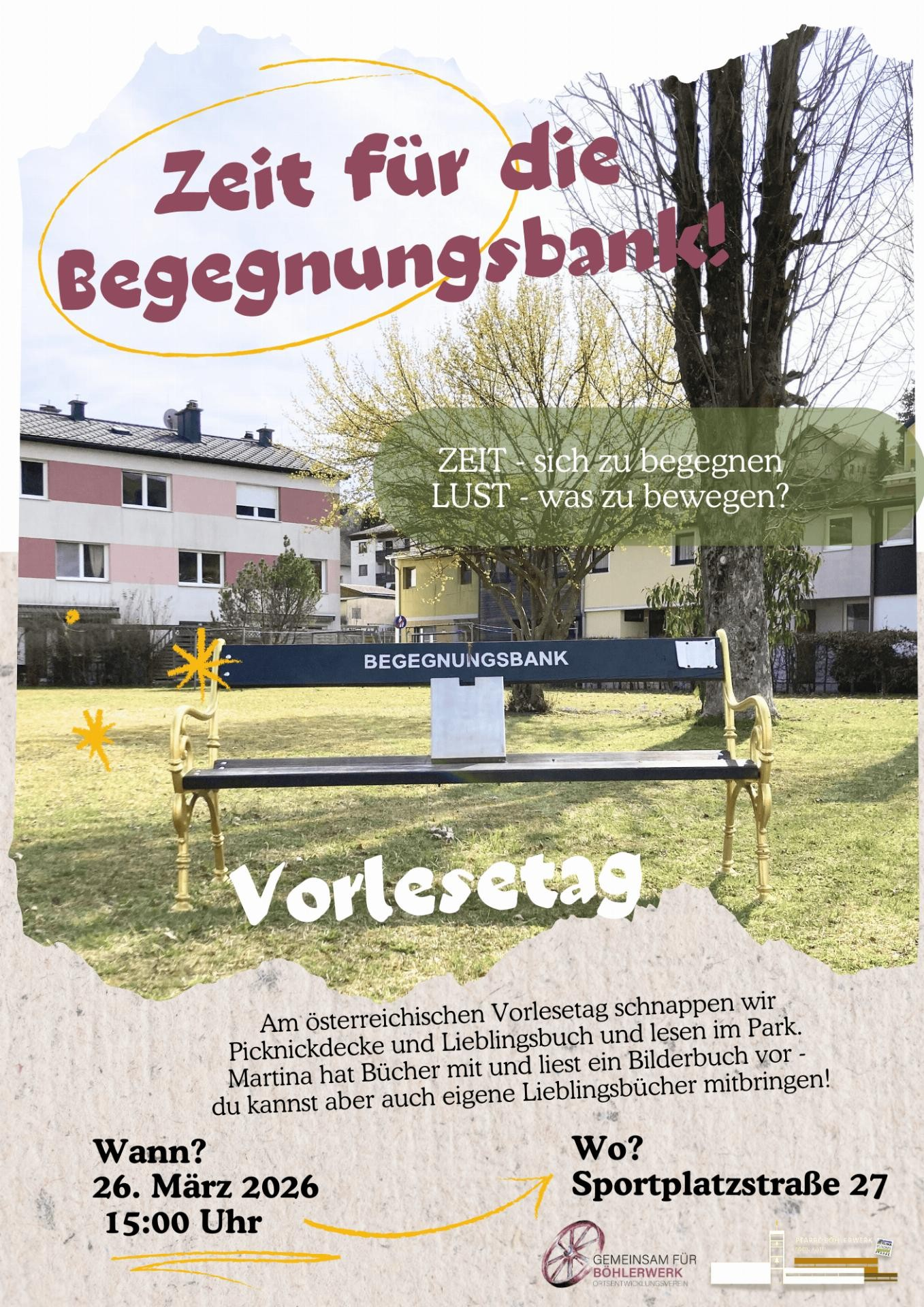 Am österreichischen Vorlesetag schnappen wir Picknickdecke und Lieblingsbuch und lesen im Park hinter der Begegnungsbank in Böhlerwerk. Martina hat Bücher mit und liest ein Bilderbuch vor – du kannst aber auch eigene Lieblingsbücher mitbringen! Die Begegnungsbank ist ein Kooperationsprojekt der Ortsentwicklung mit der Pfarre Böhlerwerk und soll Raum für Begegnung und Bewegung schaffen. 1x/Monat findet rund um den Park, an dem die Bank in diesem Jahr steht, ein kleines „Event“ statt, zu dem alle Interessierten herzlich eingeladen sind!Vorlesetag an der Begegnungsbank